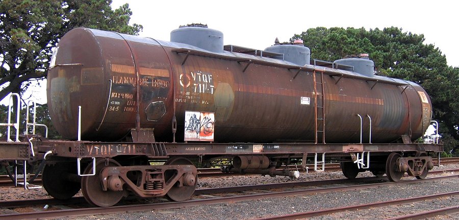 This group of rail tank cars arrived in Victoria from NSW via South Australia in 1992. They are all ex C.O.R / BP Australia rail tank cars and were built by Tulloch Ltd between 1947 and 1951. This series of wagons are unusual in Victoria as they retained their NSW style of handbrake arrangement although they did receive VR style end shunters steps and hand rails.